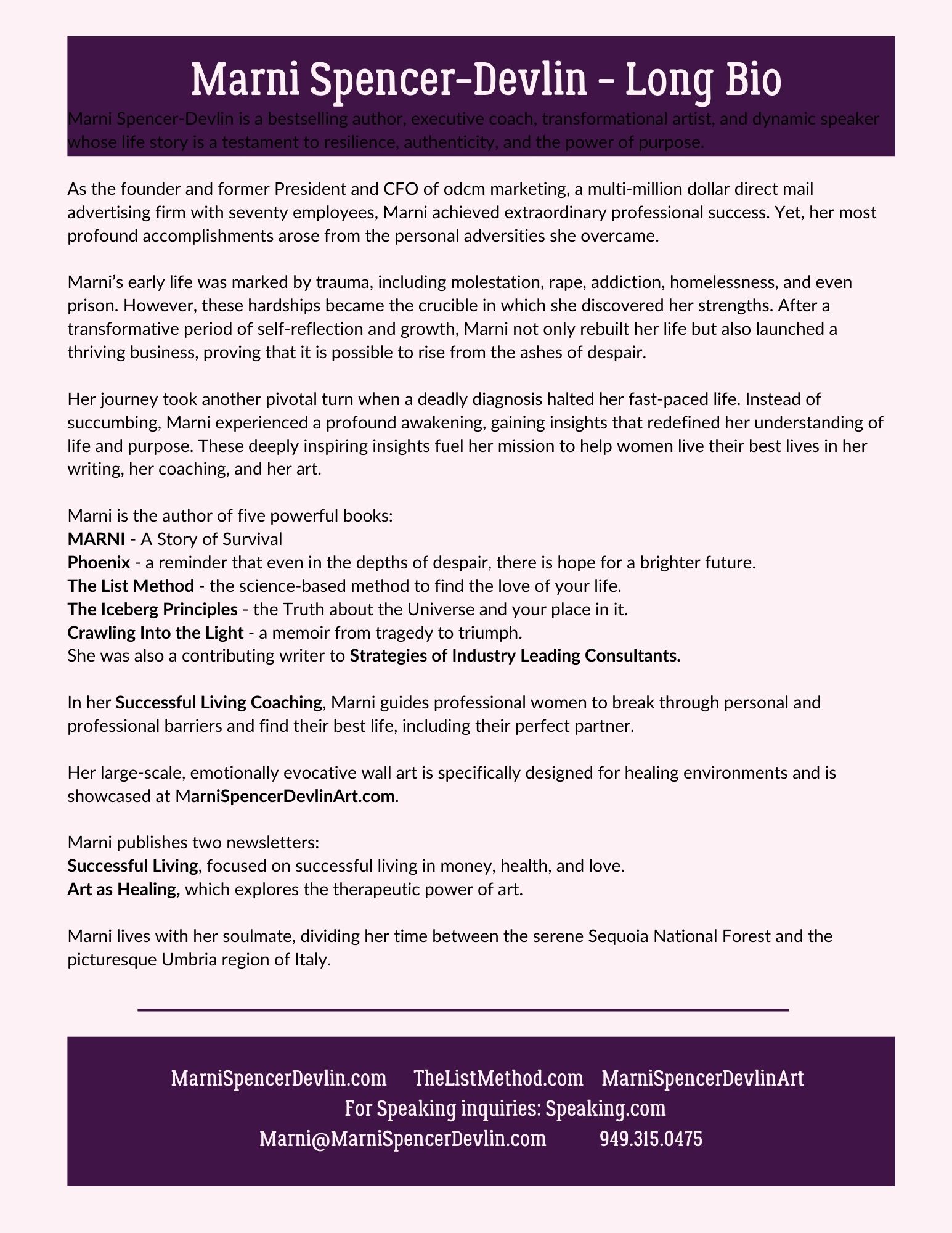 As the founder and former President and CFO of odcm marketing, a multi-million dollar direct mail advertising firm with seventy employees, Marni achieved extraordinary professional success. Yet, her most profound accomplishments arose from the personal adversities she overcame.